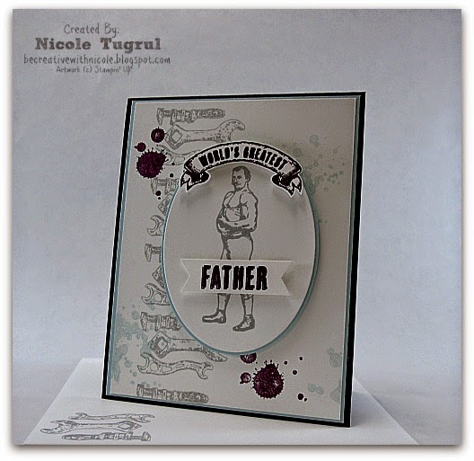 The muscle guy is stamped with Smokey Slate on an oval and layered on Soft Sky. I didn't want a big border, so I fussy cut so just a hint of blue was showing. "World's Greatest" and "Father" are stamped in the bold Blackberry Bliss so it will stand out the most. Both are popped up with dimensionals to complete the look I was going for.